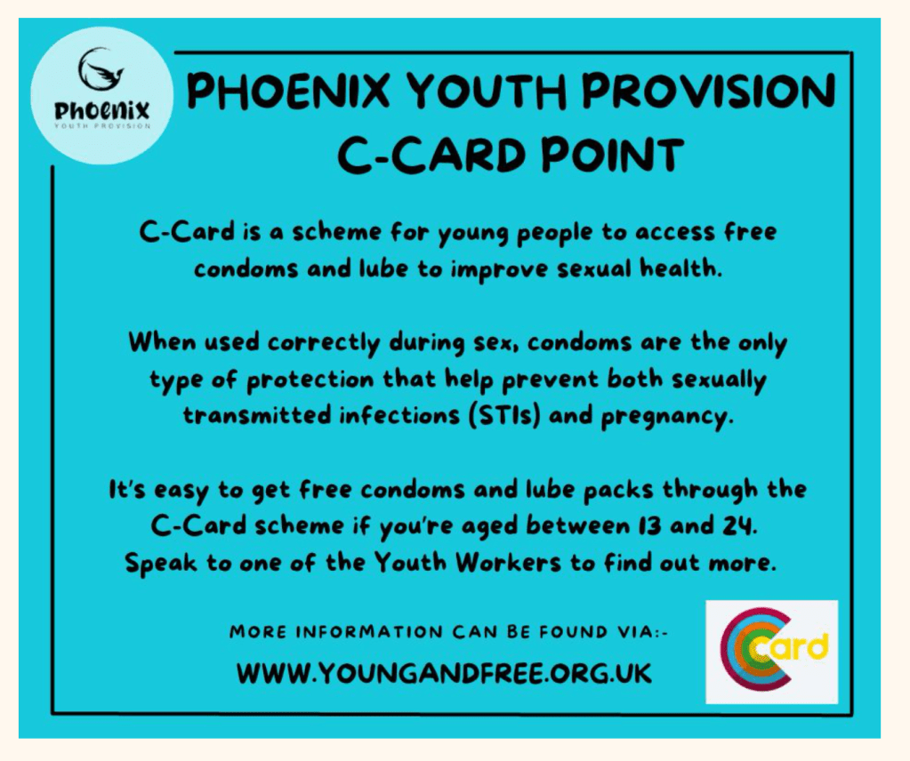 The C-Card scheme is a confidential sexual health service for young people aged 13 to 24 in the UK. The aim of the scheme is to provide free condoms and other sexual health advice and services to young people in a safe and confidential way.
